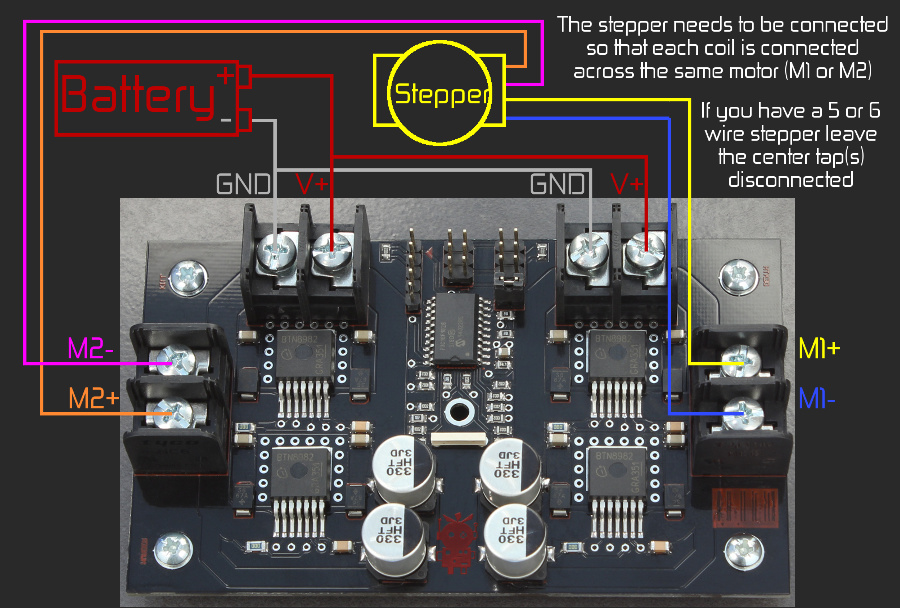 Diablo can also be used as a large stepper motor driver, driving up to 55A.You will need to add the motor to both motor outputs, and the battery / power supply to the board as shown below: