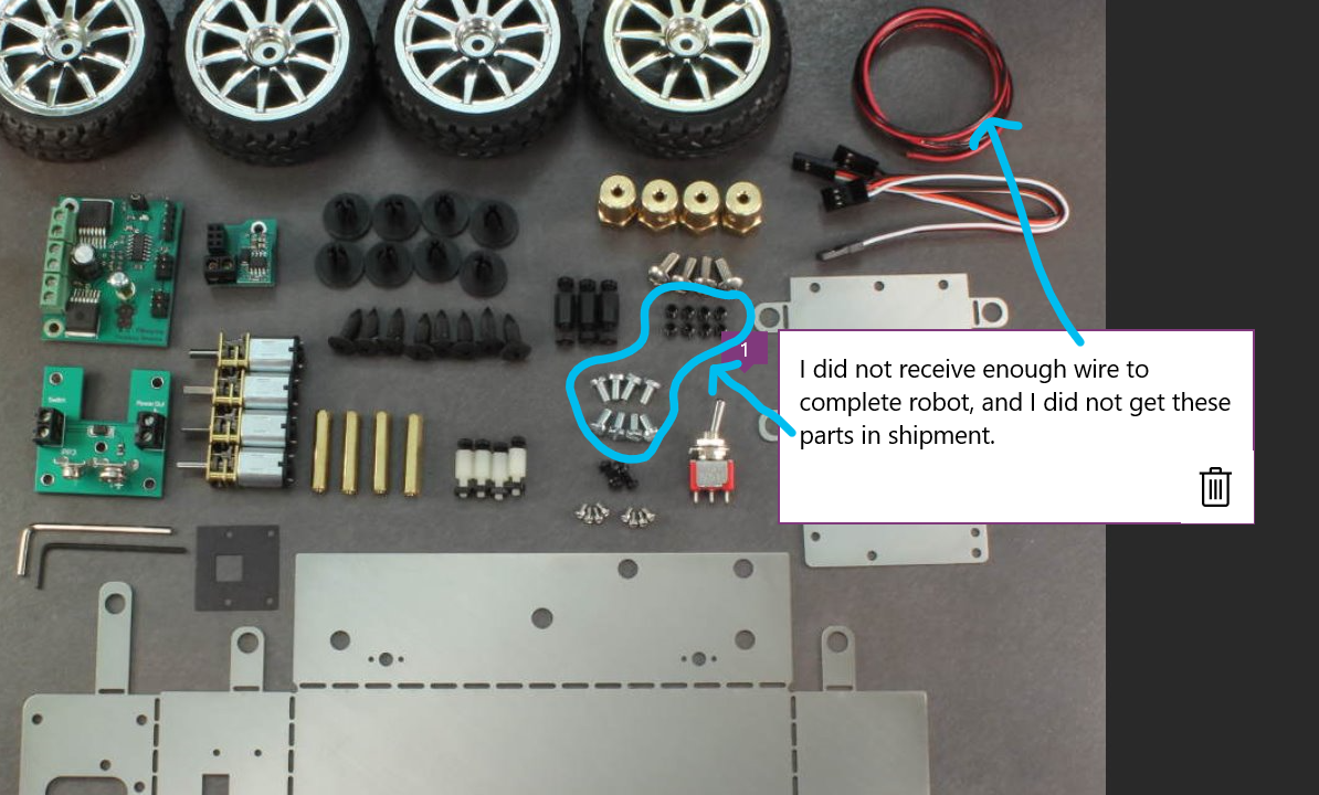 I recently received my 4Borg Kit , and there was not enough red and black wire to complete the kit , after cutting wire to the specific lengths . I was only able to cut the wire for the 4 motors with less than 4 inches left. Also the 8 cheese head screws were not included.